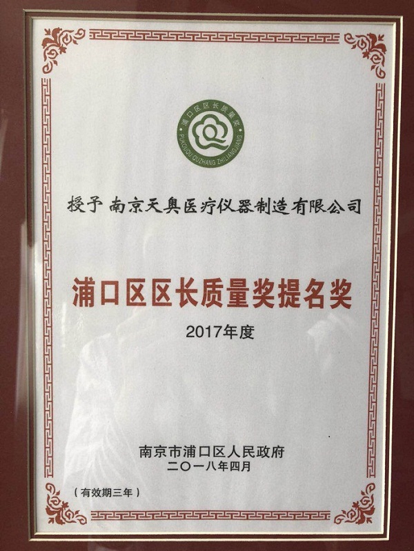 南京天奧醫(yī)療儀器制造有限公司榮獲“2017年浦口區(qū)區(qū)長質(zhì)量獎提名獎”和質(zhì)量強(qiáng)區(qū)工作區(qū)級“先進(jìn)單位”稱號。